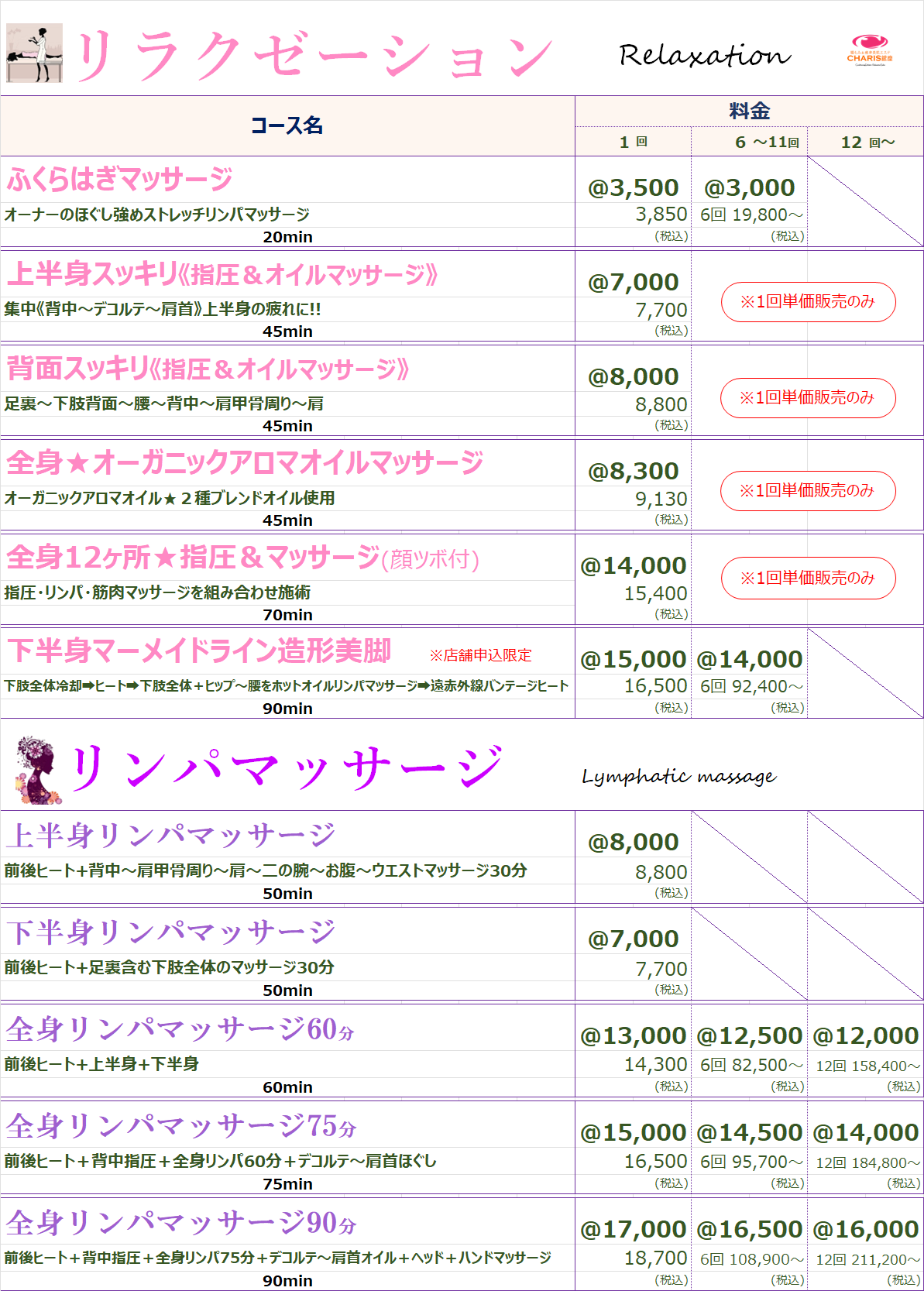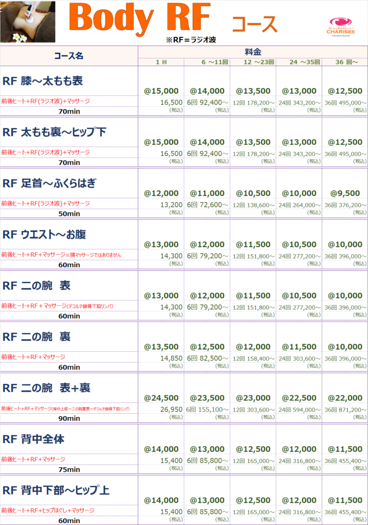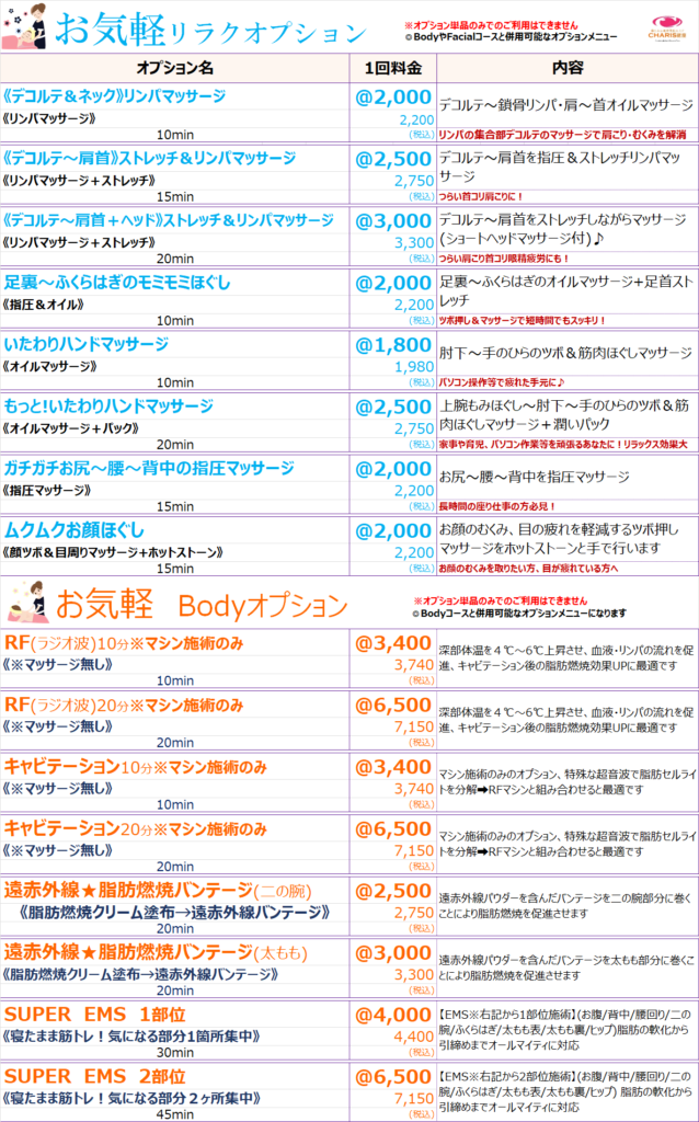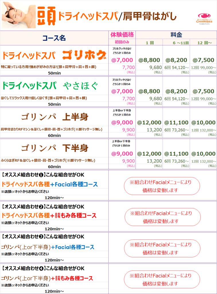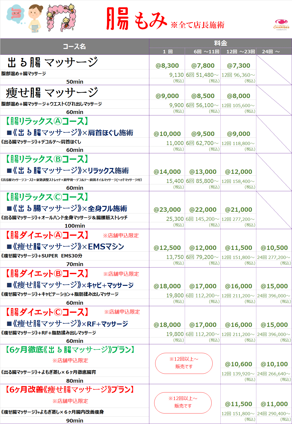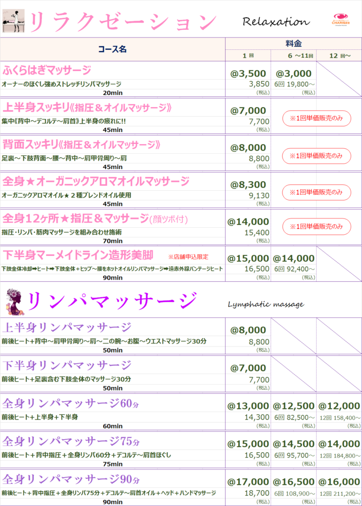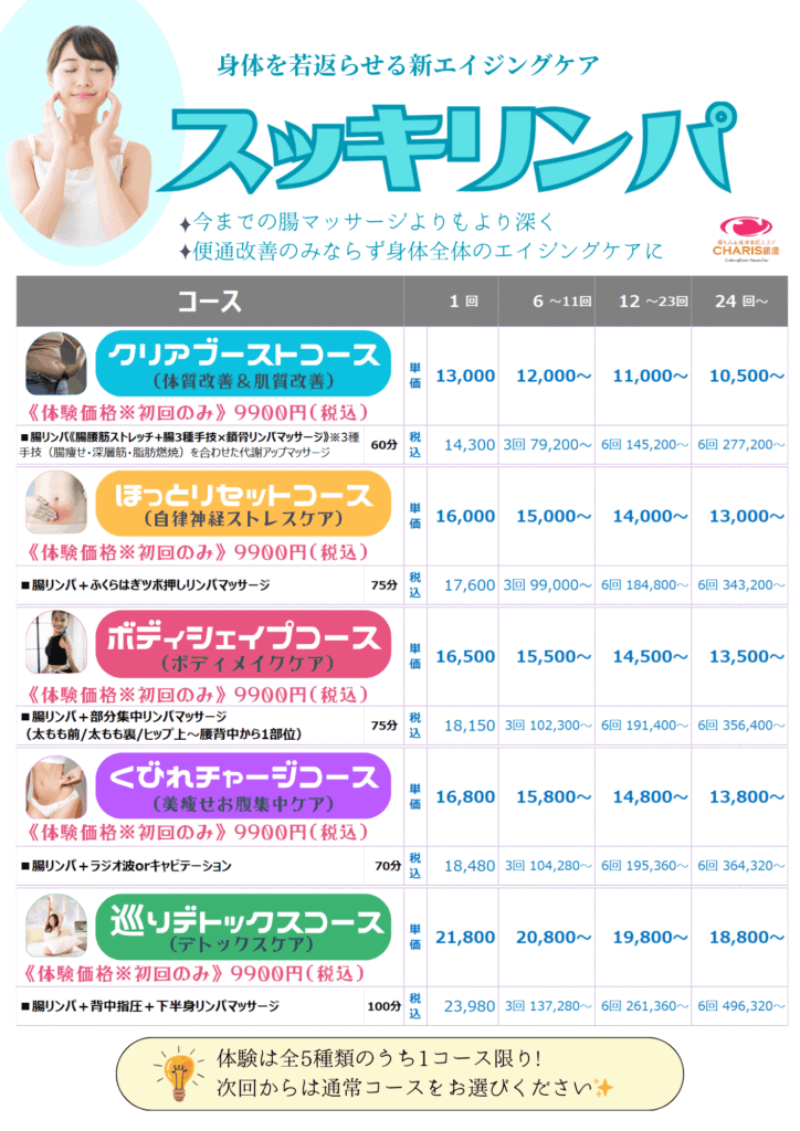 腸もみ&痩身美肌エステ CHARIS銀座 > コースメニュー %e3%82%b3%e3%83%bc%e3%82%b9%e3%83%a1%e3%83%8b%e3%83%a5%e3%83%bc コースメニュー CHARIS銀座コースメニュー 《CHARIS銀座コースメニュー》 ⚠来店ポイントやコースポイントで獲得した割引チケットは,各コース1回料金枠の価格にご利用出来ます。⚠SALE、キャンペーン等既に割引されているものにはご利用できません。 ⚠来店ポイントやコースポイントで獲得した割引チケットは,各コース1回料金枠の価格にご利用出来ます。⚠SALE、キャンペーン等既に割引されているものにはご利用できません。
